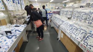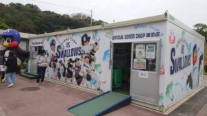 ヤクルトのキャンプ地のグッズ販売はプレハブ小屋の中で行われております。人気選手のタオル等をはじめ、ブルーシールとのコラボグッズやつば九郎のグッズなどが販売されています。各商品の数量は豊富ですが、種類やバリエーションは少ないように感じました。