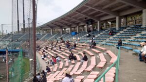 メインの球場は、三塁側のスタンドが入り口となっており、入り口が各所から遠い印象です。バックネット裏も入り口から遠いですが、バックネット裏の真後ろに立ち入り禁止場所がほとんどなく、ホームベースの真後ろから練習を見ることができるのは良いところです。