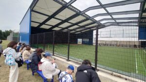 ブルペンは投手と捕手のスペースが屋根付きで、観客との仕切りは金網フェンスとなっています。観客は片側からの観覧となります。北谷と比べて観客のスペースが広く、最前列には椅子があり、見やすい印象でした。