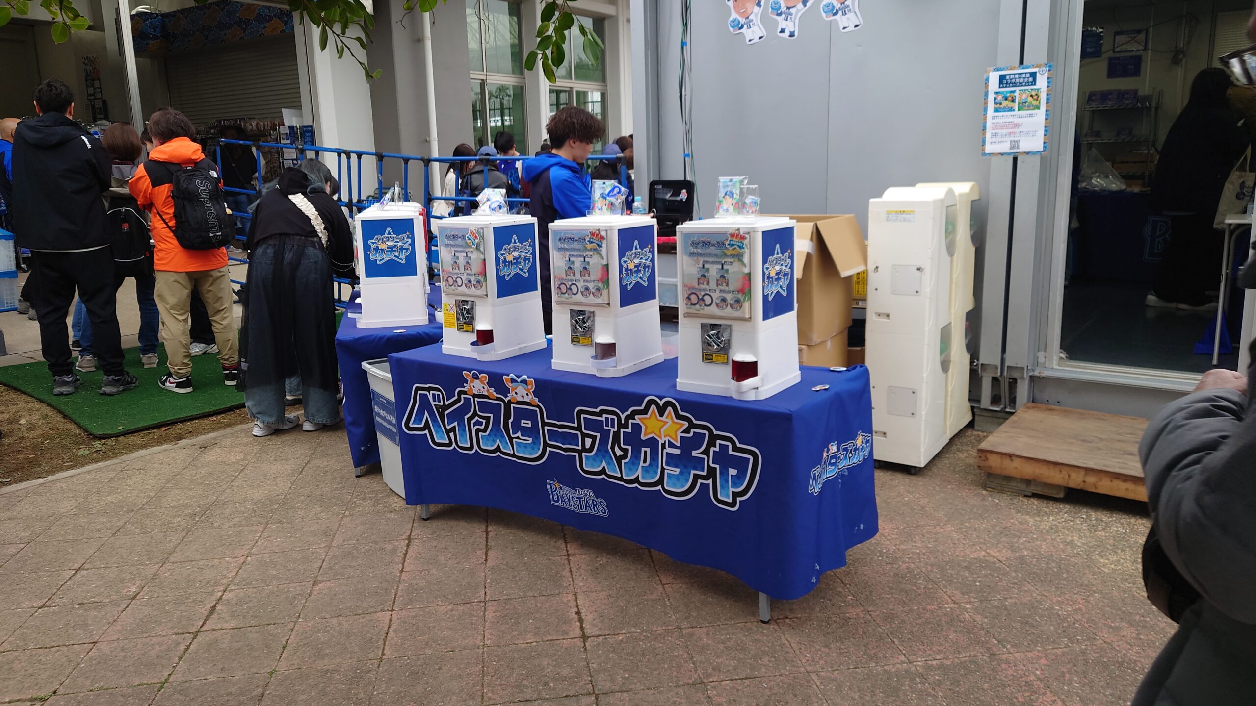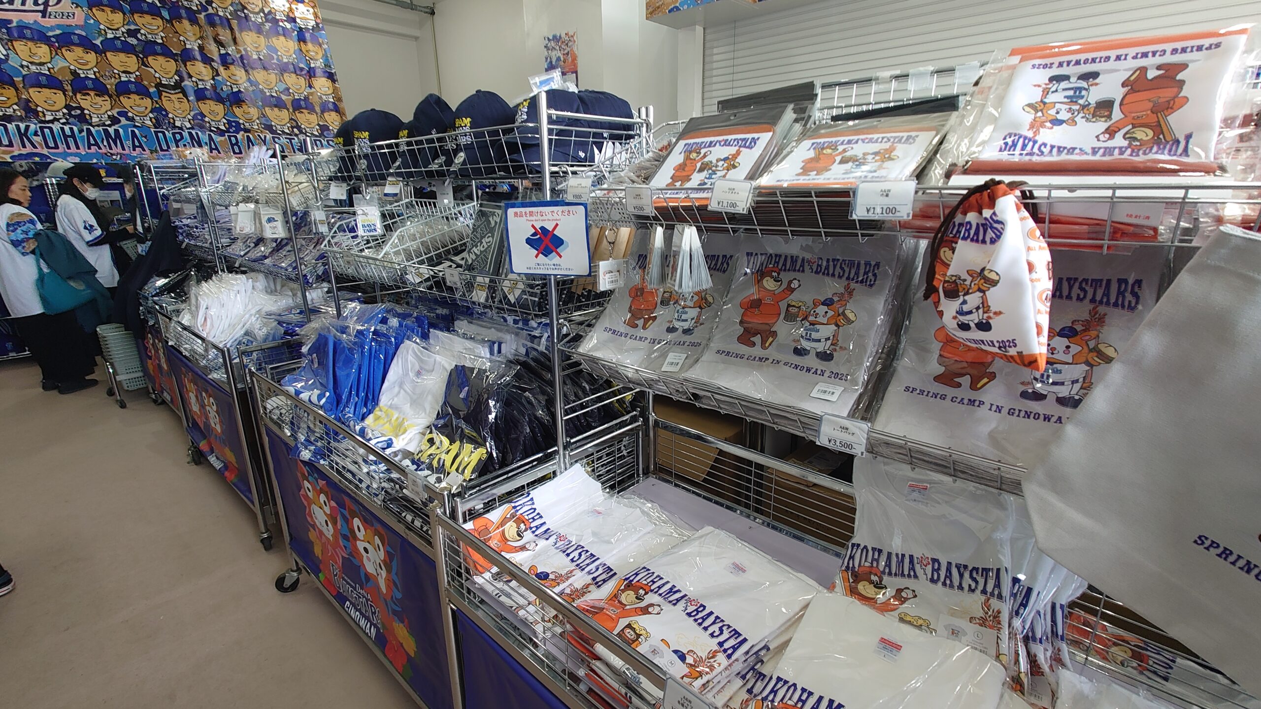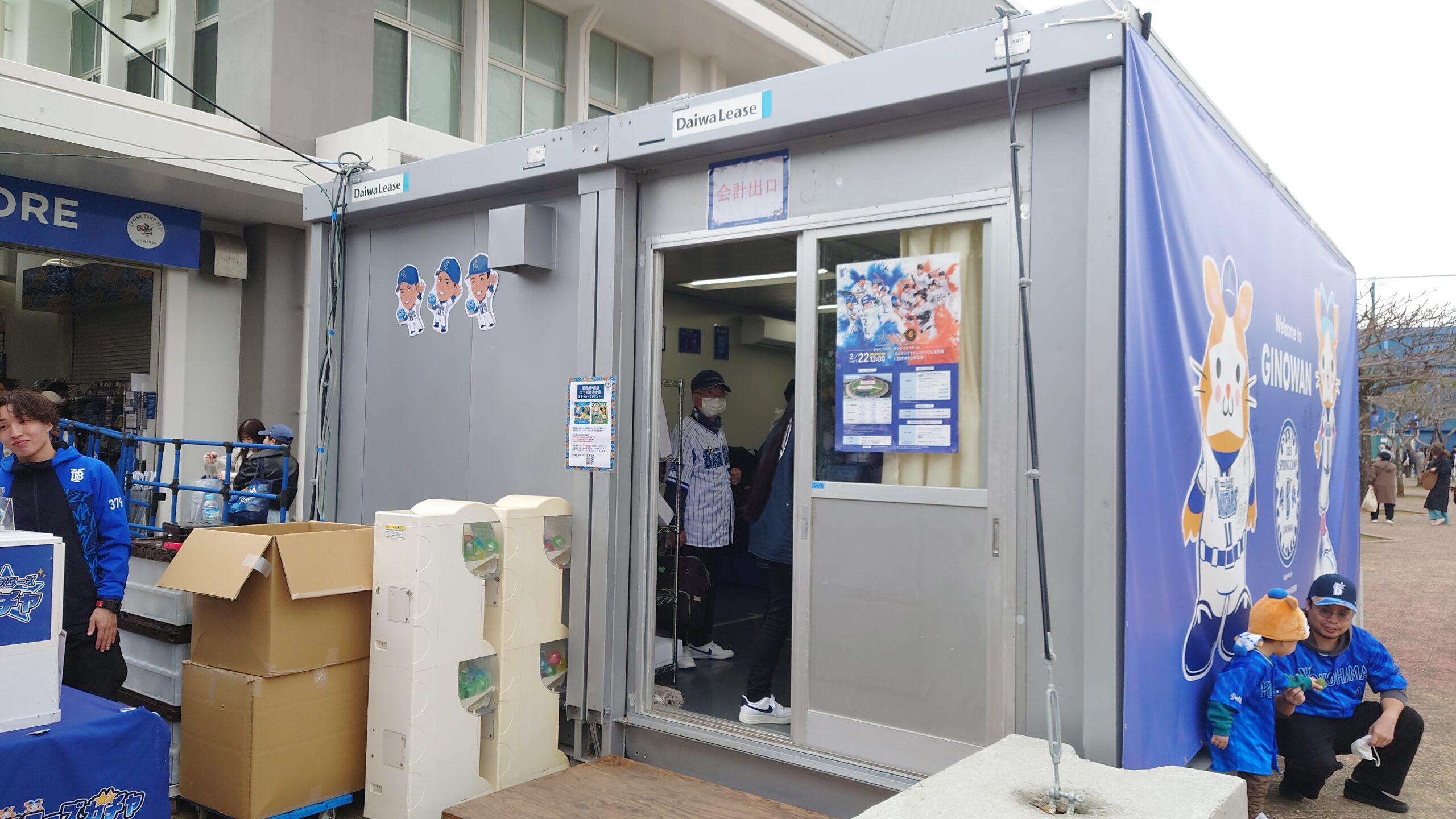 DeNAのキャンプのグッズ売り場は駐車場から近いところにあり、すぐに場所がわかります。屋内練習場の施設の一部にグッズが置いてあり、会計はプレハブ小屋で行うといった方式となっております。ドラゴンズのグッズと比べて種類が豊富でバリエーション豊かだと感じました。ガチャポンなどもありました。
