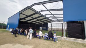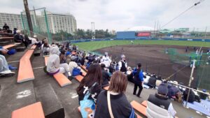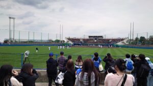 ブルペンは投手と捕手のスペースが屋根付きで、観客との仕切りは金網フェンスとなっています。観客は片側からの観覧となります。北谷と比べて観客のスペースが広く、最前列には椅子があり、見やすい印象でした。